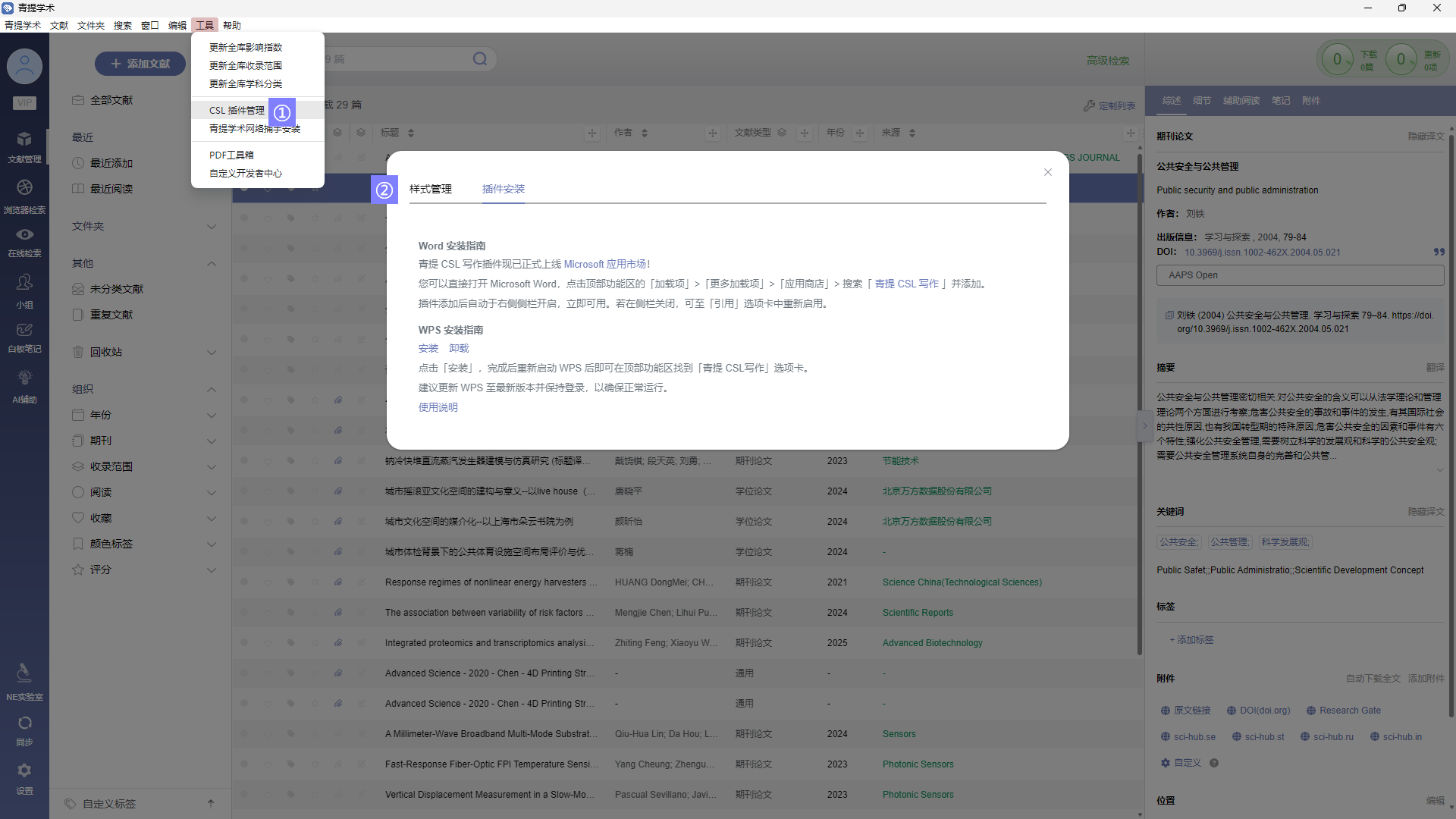 目录 搜索 青提学术简介桌面端使用指南下载及安装用户权益及获取方式普通用户注册及登录使用 CARSI 认证注册机构用户使用“机构代码”注册机构用户文献添加与搜集文件添加PDF、CAJ 文件导入文章信息自动补全格式化文件导入NE数据导入手动添加标识符/标题添加浏览器检索在线检索关键词检索(高级检索)AI 增强检索文献管理目录结构全部文献最近文件夹创建文件夹虚拟文件夹重命名文件夹删除文件夹未分类文献重复文献回收站组织自定义标签列表结构本地检索数据同步数据迁移文献信息综述细节笔记附件手动添加附件自动下载全文手动下载全文更多数据源文献阅读笔记编辑侧栏翻译全文翻译图表提取辅助阅读实用工具小组新建小组在小组内添加文献邀请成员加入小组在小组内阅读与协作青提学术写作插件写作步骤格式化更新题录样式编辑引文定位引文查找引文清除域代码去除格式化设置青提学术CSL写作插件安装指引-Windows系统安装指引-macOS系统安装指引-HarmonyOS系统授权登录写作步骤样式管理AI 辅助写作辅助润色改写降重续写大纲审稿深度研究(v2.5.2)PDF 工具箱青提学术 MCP自定义开发者中心白板笔记WebDAV 同步附件多文献阅读技术支持软件设置移动端使用指南下载注册及登录数据同步、查看、阅读与播报WebDAV 配置数据管理数据添加扫码添加DOI/标题添加检索添加 暂无相关搜索结果! 本文档使用 MinDoc 发布 青提学术CSL写作插件 Windows 和 macOS 系统可以通过主菜单-工具-CSL插件管理的提示进行安装,支持在 MS Word 和 WPS 内使用,HarmonyOS 系统可以根据安装指引进行安装。 1.安装指引 Windows macOS HarmonyOS2. 授权登录3. 写作步骤4. 样式管理[English]文档更新时间: 2025-12-24 18:41 作者:管理员