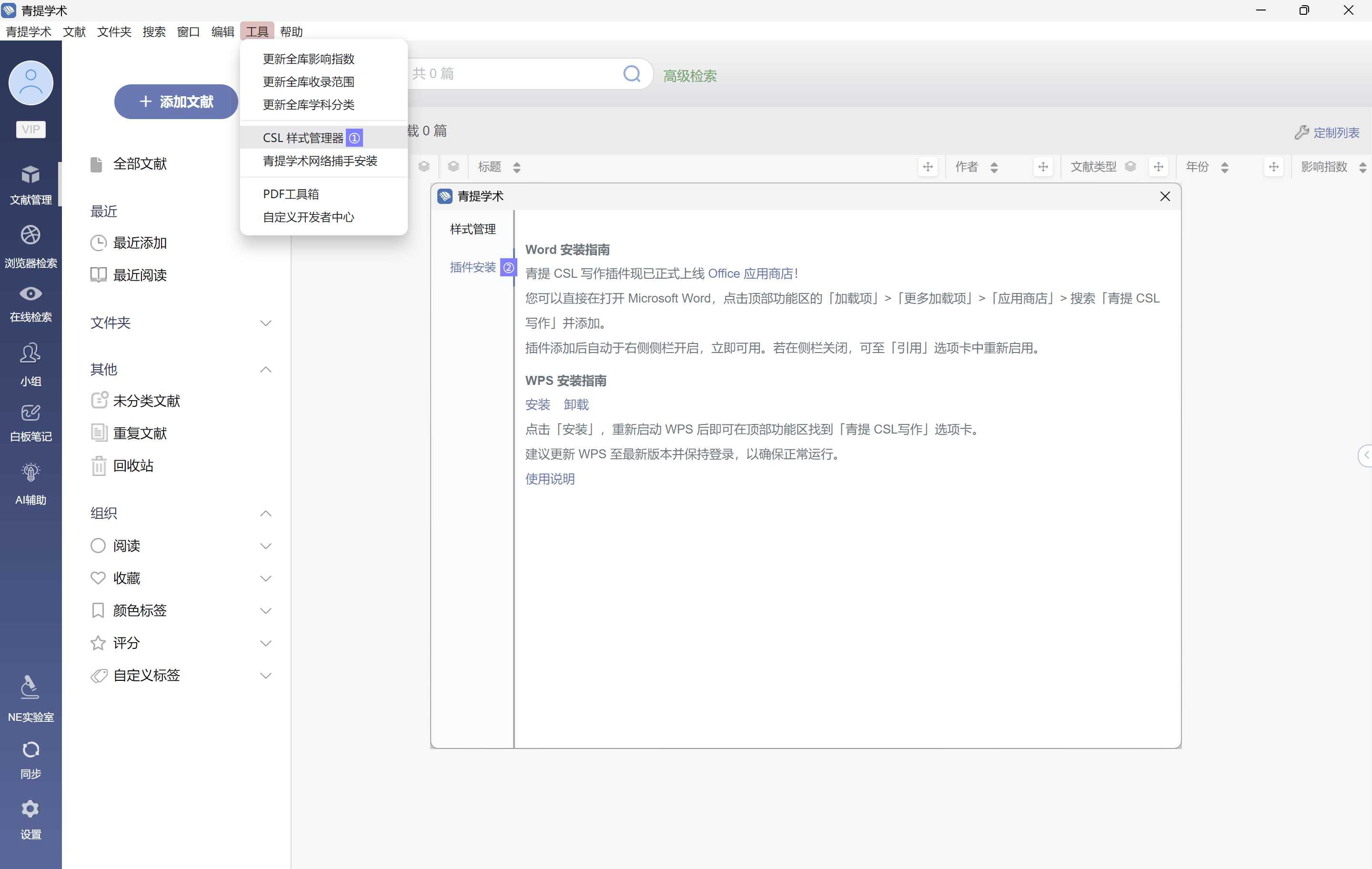 目录 搜索 青提学术简介下载及安装用户权益及获取方式普通用户注册及登录使用 CARSI 认证注册机构用户使用“机构代码”注册机构用户桌面端使用指南文献添加与搜集文件添加PDF、CAJ 文件导入文章信息自动补全格式化文件导入NE数据导入手动添加DOI/标题添加浏览器检索在线检索关键词检索(高级检索)AI 增强检索文献管理目录结构全部文献最近阅读最近添加未分类的文献删除重复文章回收站文件夹管理虚拟文件夹创建文件夹重命名文件夹删除文件夹改变文件夹的顺序和从属关系文件夹分类管理文章标识组织文章收藏标签管理列表筛选本地检索自定义表头和文章排序文献信息综述细节笔记附件手动添加附件自动下载全文手动下载全文更多数据源数据同步文献阅读笔记编辑侧栏翻译全文翻译图表提取实用工具青提学术写作插件写作步骤格式化更新题录样式编辑引文定位引文查找引文清除域代码去除格式化设置青提学术CSL写作插件安装指引-Windows系统安装指引-macOS系统安装指引-HarmonyOS系统授权登录写作步骤样式管理(v2.5.5)更多设置AI 辅助写作辅助润色改写降重续写大纲审稿深度研究(v2.5.2)PDF 工具箱青提学术 MCP自定义开发者中心(v2.5.2)白板笔记(v2.5.2)WebDAV 同步附件(v2.5.5)技术支持小组新建小组在小组内添加文献邀请成员加入小组在小组内阅读与协作软件设置数据迁移手机端使用指南下载注册及登录数据同步、查看、阅读与播报数据管理数据添加扫码添加DOI/标题添加检索添加 暂无相关搜索结果! 本文档使用 MinDoc 发布 青提学术CSL写作插件 在 v2.5.4 版本更新后,Windows 和 macOS 系统可以通过主菜单-帮助-CSL写作插件的提示进行安装,支持在 MS Word 和 WPS 内使用,HarmonyOS 系统可以根据安装指引进行安装。 1.安装 Windows macOS HarmonyOS2. 授权登录3. 写作步骤4. 样式管理 v2.5.65. 更多设置文档更新时间: 2025-10-29 17:25 作者:管理员