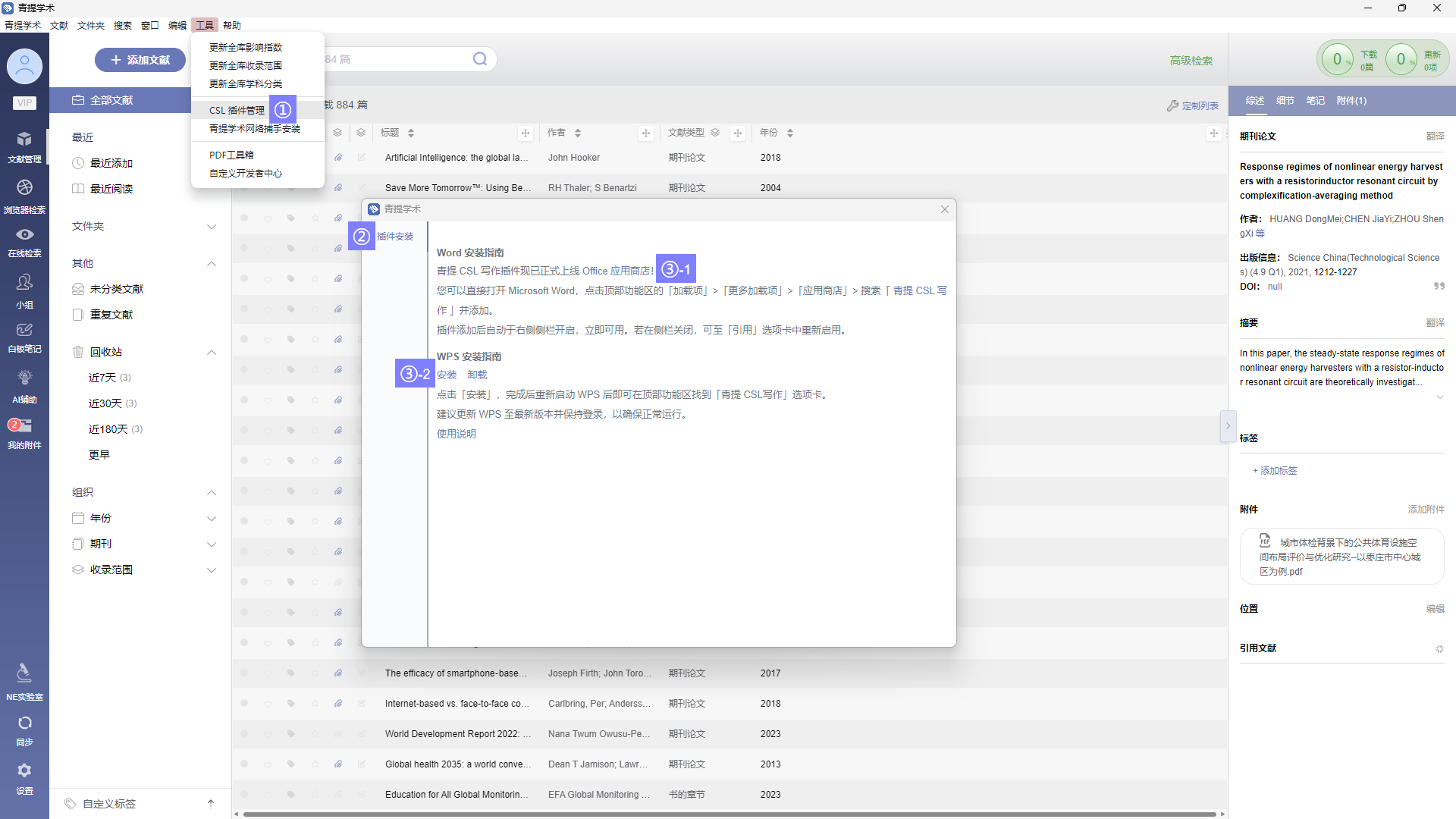 在 v2.5.4 版本更新后,Windows 和 macOS 系统可以通过主菜单-工具-CSL插件管理的提示进行安装,支持在 MS Word 和 WPS 内使用,HarmonyOS 系统可以根据安装指引进行安装。 1.安装指引 Windows macOS HarmonyOS2. 授权登录3. 写作步骤4. 样式管理 v2.5.8[English]文档更新时间: 2025-12-15 16:32 作者:管理员