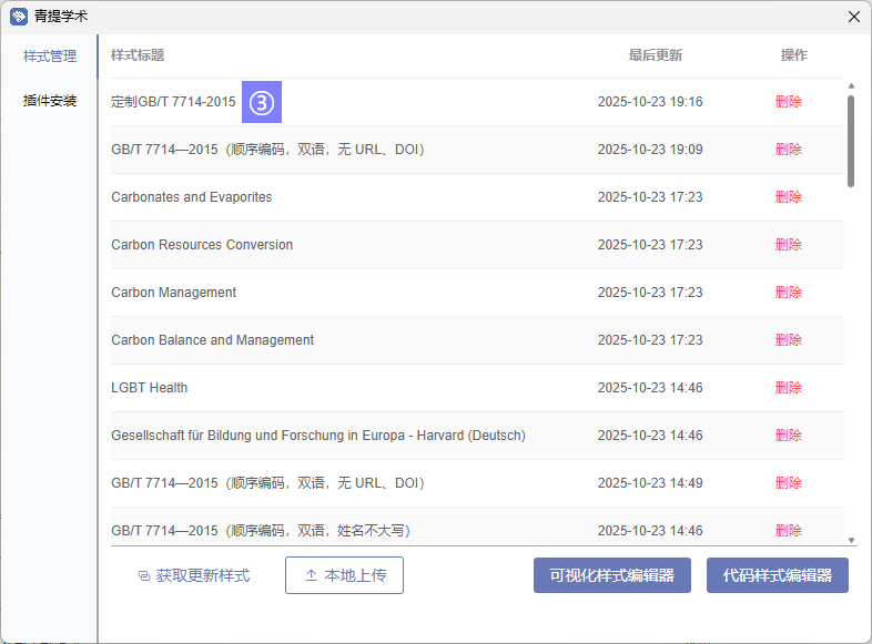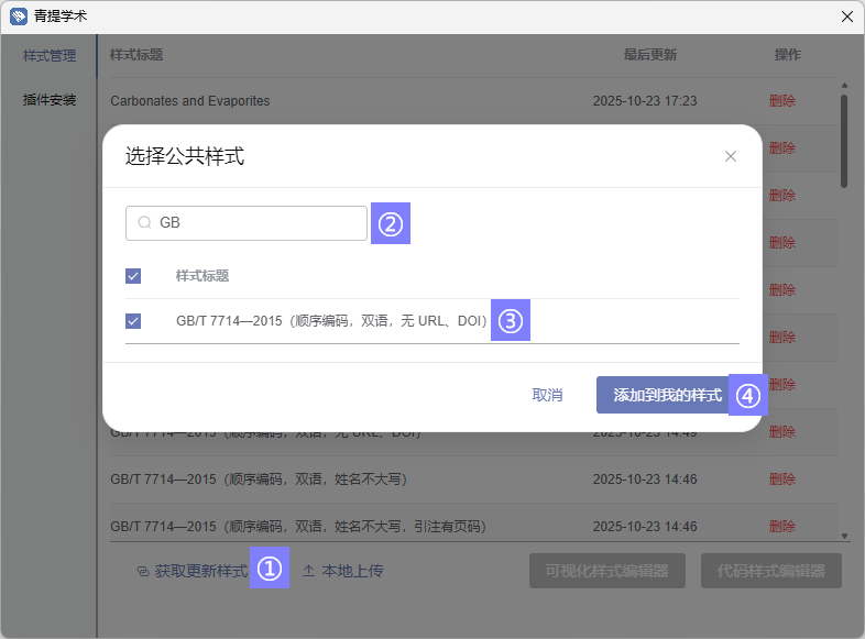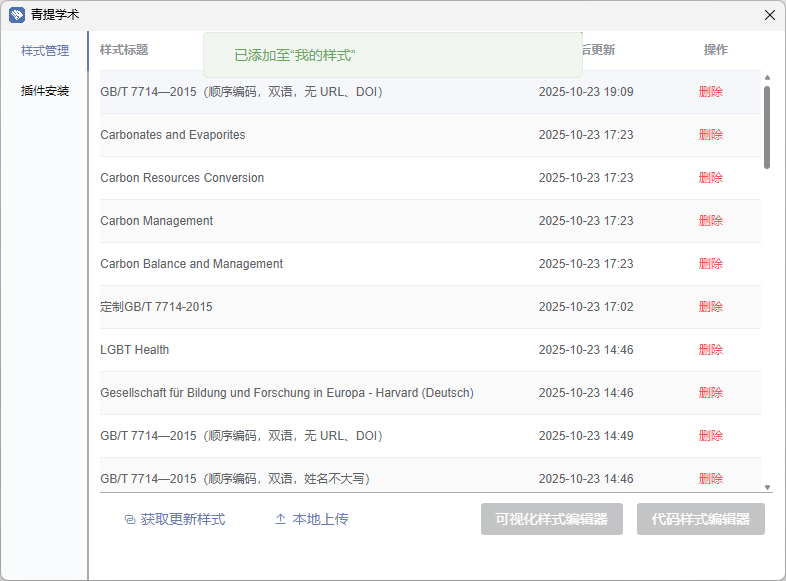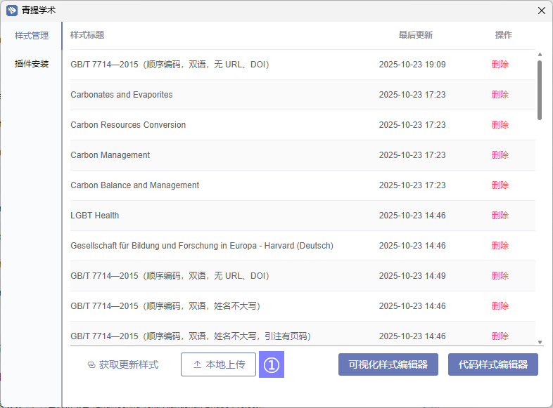 通过【本地上传】,可上传本地的 .csl文件 至个人样式库: