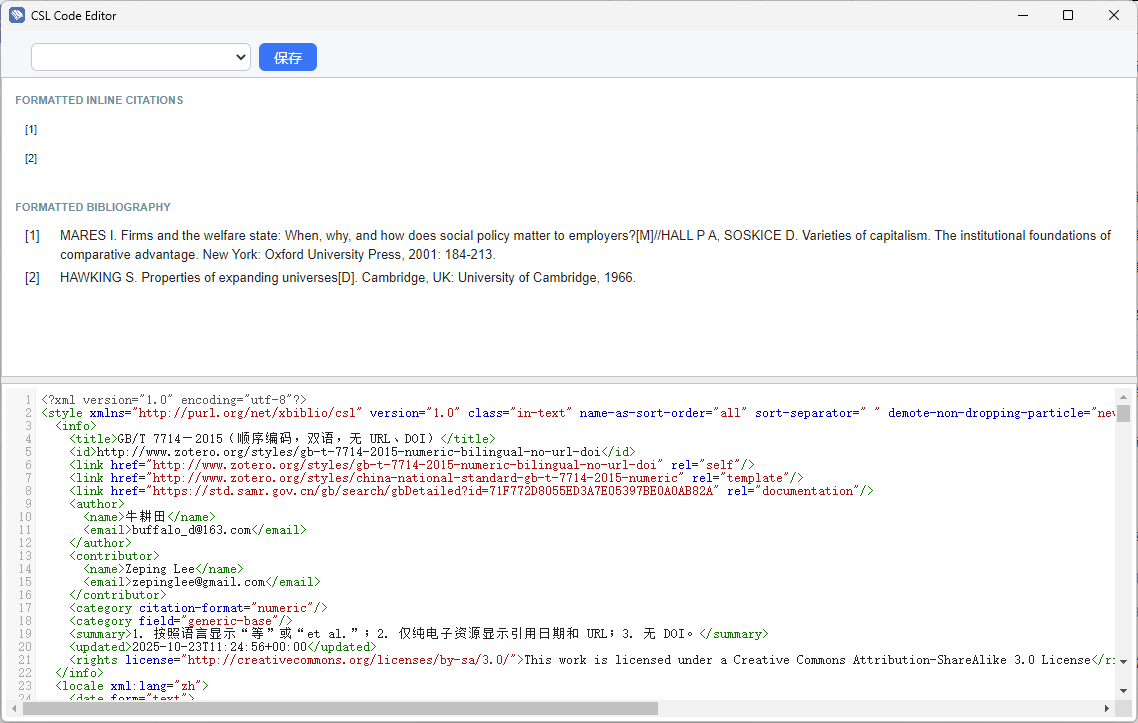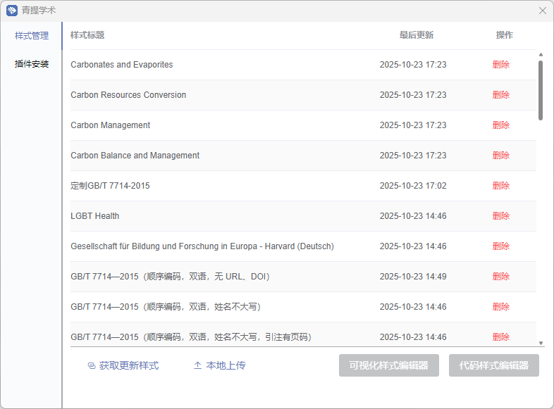 在 v2.5.5 版本更新后,在通过菜单-工具-CSL插件管理打开的窗口中,增加了样式管理,在这里可以查看、获取、编辑、删除、整理个人的样式库。