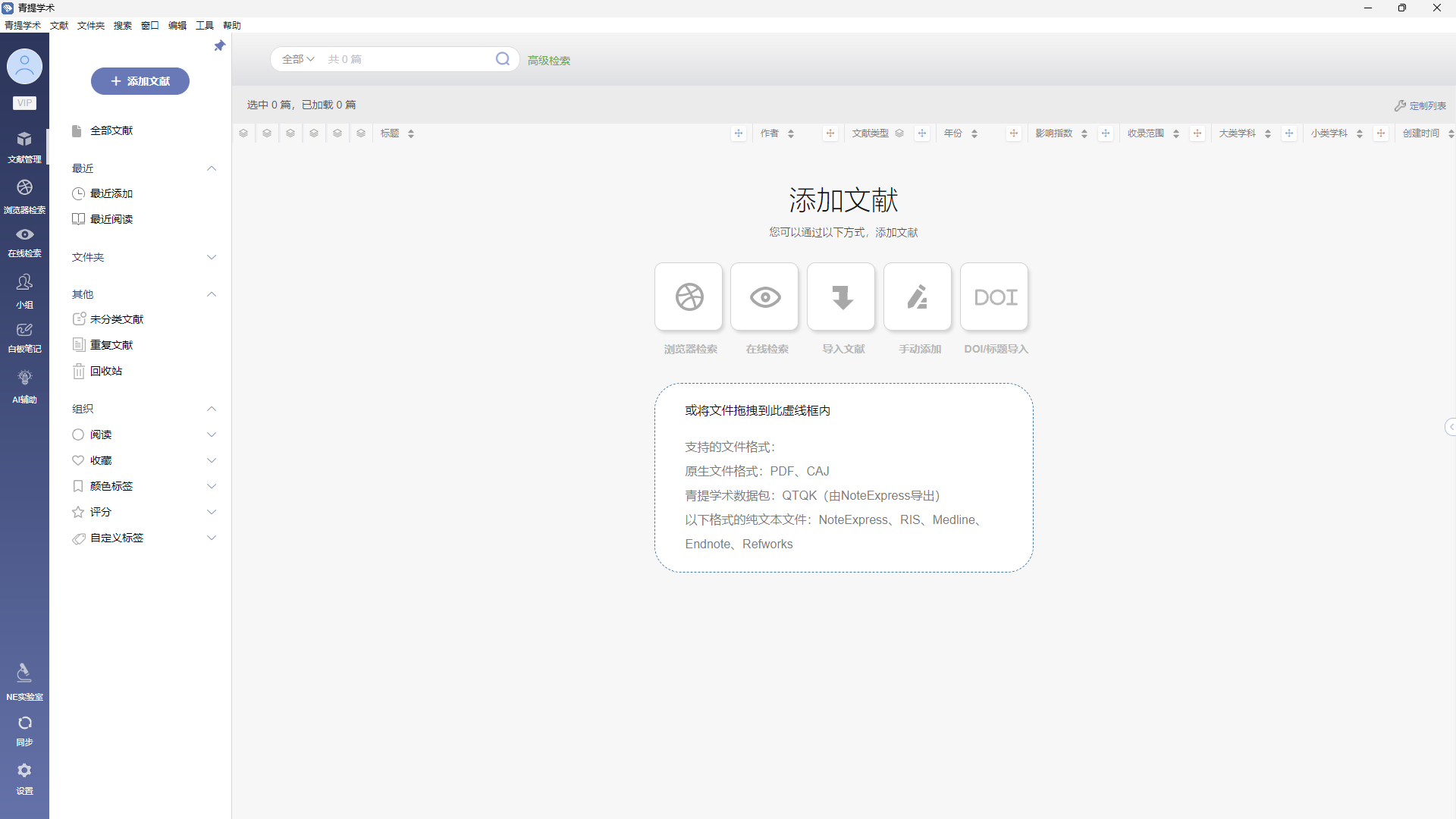 青提学术提供了多种便捷的导入方式,包括: 文件添加:包括附件文件、格式化文件、NE 文件,手动添加:支持通过检索标题、DOI添加,也支持手动输入字段信息添加浏览器检索:提供内置的浏览器,也支持 Chrome、Edge 浏览器使用插件保存,在线检索:支持关键词检索、指令检索和 AI 增强搜索 助力高效、灵活地管理文献资源。 文档更新时间: 2025-10-27 12:38 作者:管理员