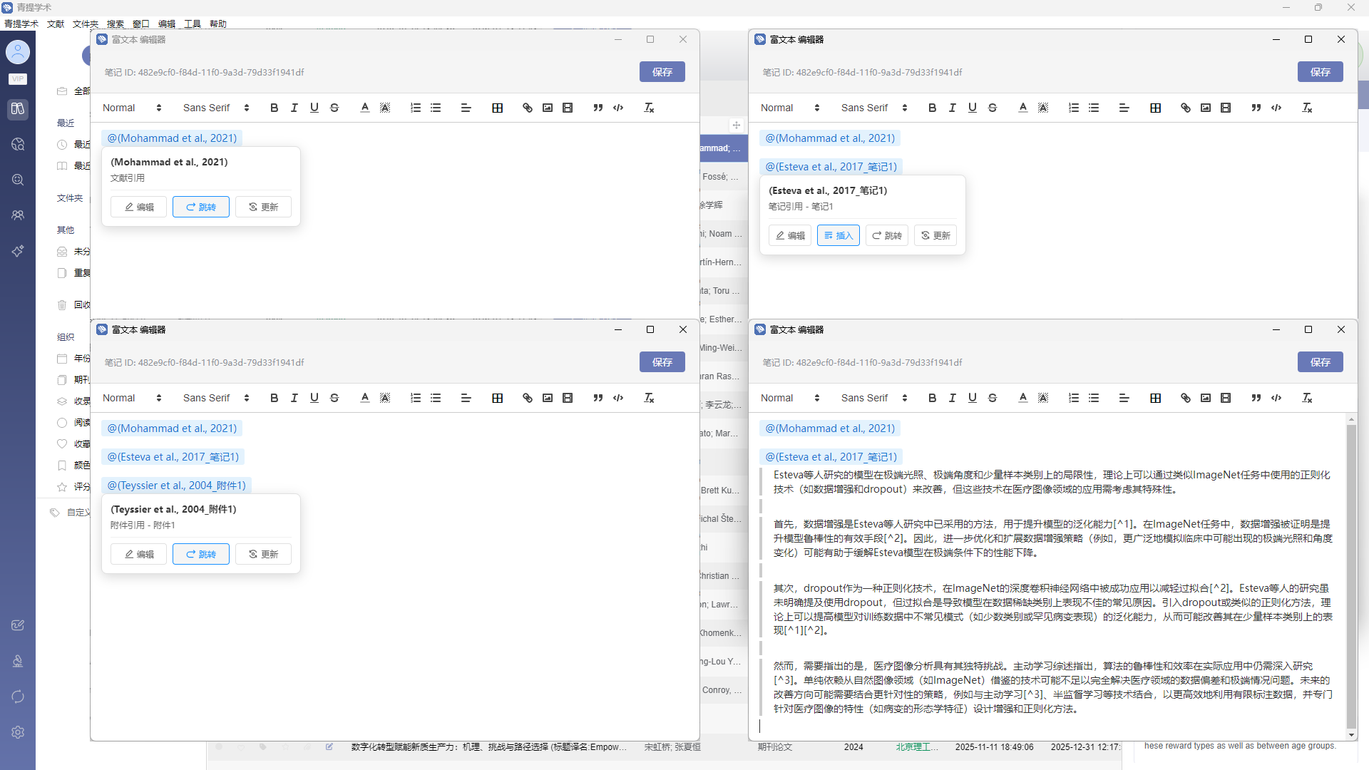 - 快速跳转:在笔记中的链接悬停,可选择跳转至对应的文献条目、笔记或附件查看,也可支持将笔记全文插入到当前笔记光标所在的位置。