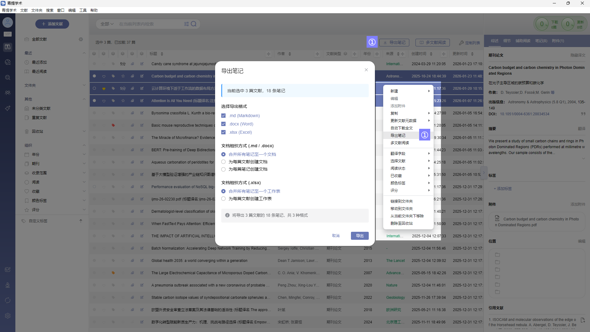 - 合并导出:将所有选中的笔记整合到一个文件中,并按所属文献自动分节,便于快速生成阅读报告。
