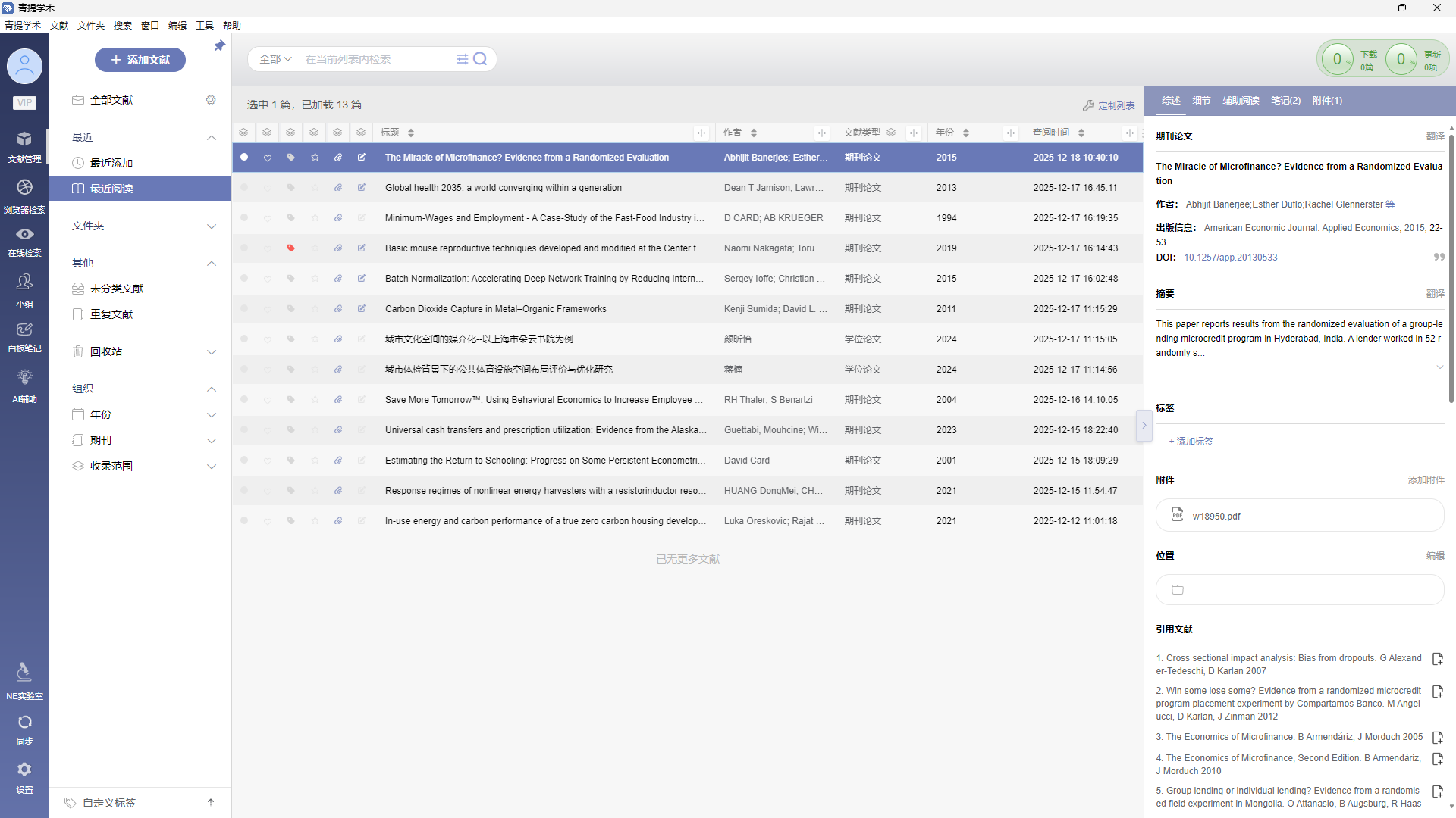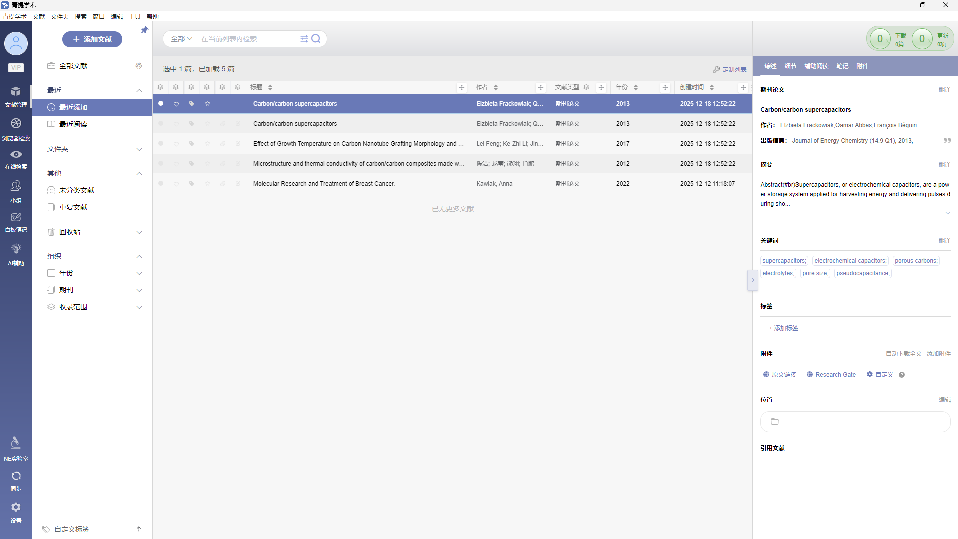 目录 搜索 青提学术简介桌面端使用指南下载及安装用户权益及获取方式普通用户注册及登录使用 CARSI 认证注册机构用户使用“机构代码”注册机构用户文献添加与搜集文件添加PDF、CAJ 文件导入文章信息自动补全格式化文件导入NE数据导入手动添加标识符/标题添加浏览器检索在线检索关键词检索(高级检索)AI 增强检索文献管理目录结构全部文献最近文件夹创建文件夹虚拟文件夹重命名文件夹删除文件夹未分类文献重复文献回收站组织自定义标签列表结构本地检索数据同步数据迁移文献信息综述细节笔记附件手动添加附件自动下载全文手动下载全文更多数据源文献阅读笔记编辑侧栏翻译全文翻译图表提取辅助阅读实用工具小组新建小组在小组内添加文献邀请成员加入小组在小组内阅读与协作青提学术写作插件写作步骤格式化更新题录样式编辑引文定位引文查找引文清除域代码去除格式化设置青提学术CSL写作插件安装指引-Windows系统安装指引-macOS系统安装指引-HarmonyOS系统授权登录写作步骤样式管理AI 辅助写作辅助润色改写降重续写大纲审稿深度研究(v2.5.2)PDF 工具箱青提学术 MCP自定义开发者中心白板笔记WebDAV 同步附件多文献阅读技术支持软件设置移动端使用指南下载注册及登录数据同步、查看、阅读与播报WebDAV 配置数据管理数据添加扫码添加DOI/标题添加检索添加 暂无相关搜索结果! 本文档使用 MinDoc 发布 最近 通过【最近添加】栏,可以快速找到最近七天添加的文献。 通过【最近阅读】栏,可以快速找到七天内阅读过的文献。 文档更新时间: 2025-12-18 16:09 作者:管理员