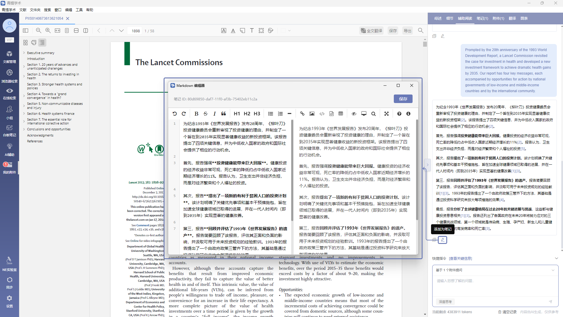 点击左下角的复制按钮可直接复制回答内容,也可点击笔记按钮直接将回答内容添加为当前文献条目的 Markdown 笔记