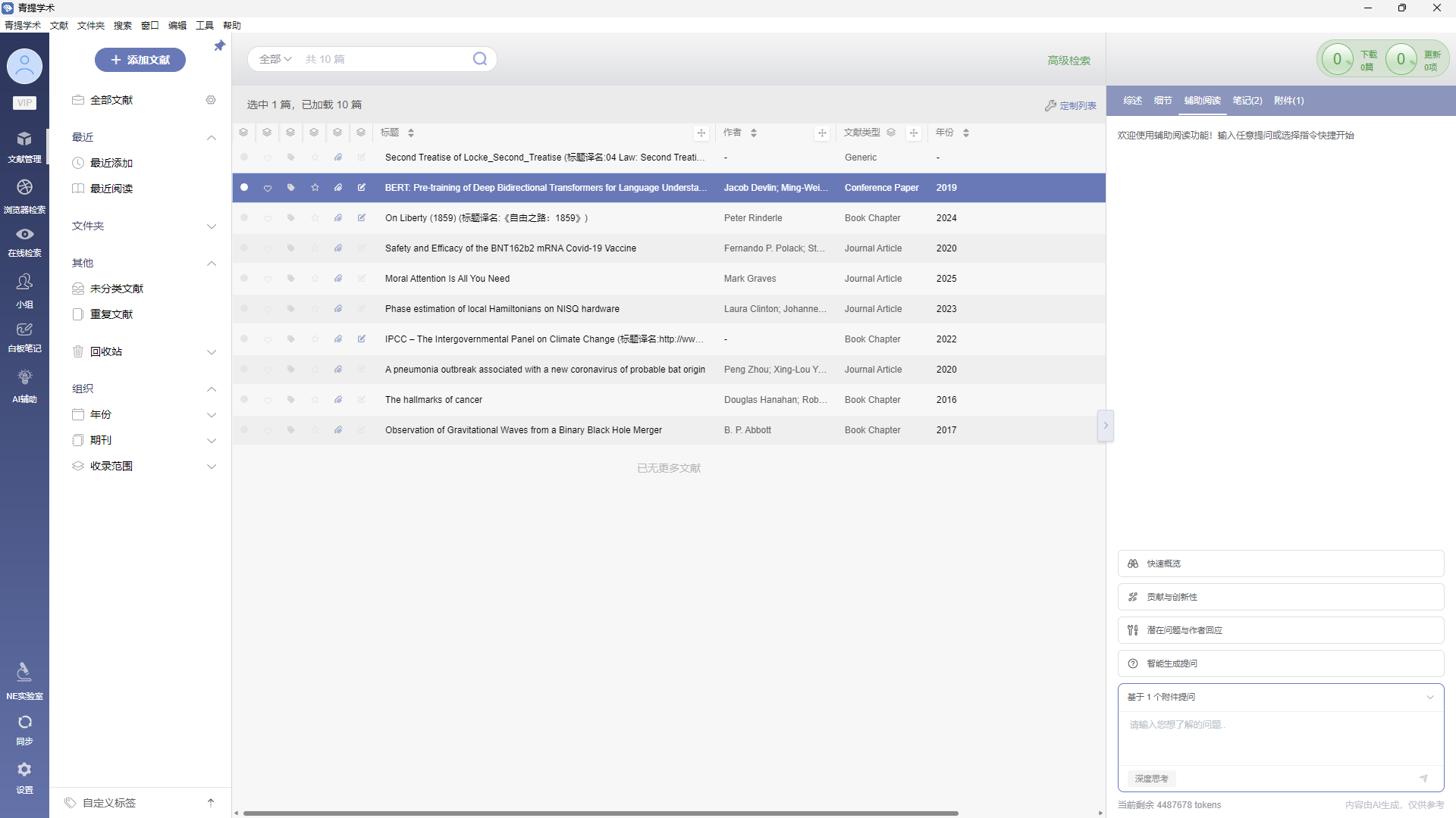在 v2.6.0 版本更新后,即可使用辅助阅读功能,对含有附件的文献,在侧栏切换至辅助阅读栏即可快速开启。
