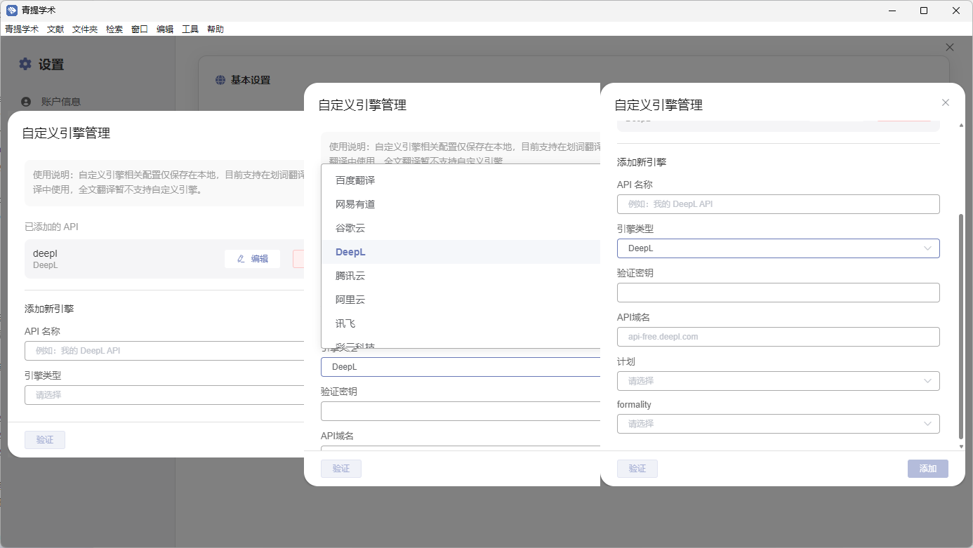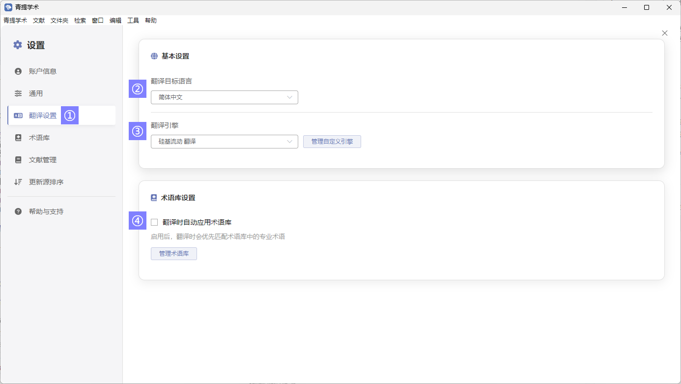 青提学术支持自定义翻译引擎和翻译目标语言,帮助您根据不同场景选择最适合的翻译服务(v2.8.0)。