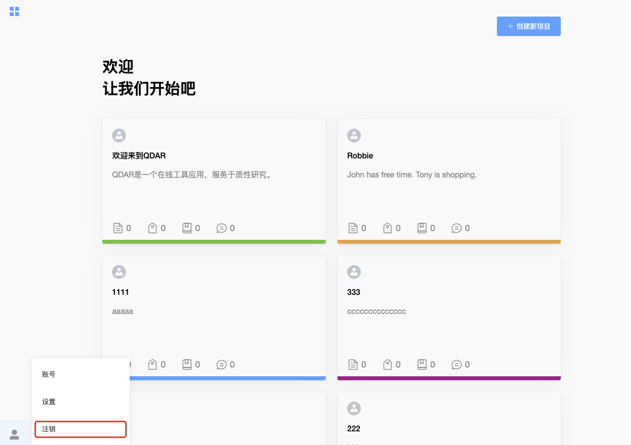 目录 搜索 简介基本功能注册与登录退出登录项目管理项目列表创建新项目项目内导航项目设置文档管理文档列表创建新文档文档的基本管理文档编辑对文档添加引用文档分组编码管理编码列表创建新编码编码的基本管理查看编码信息编码分组引用管理引用列表引用的基本管理备注管理备注列表创建新备注备注的基本管理 暂无相关搜索结果! 本文档使用 MinDoc 发布 退出登录 退出登录在进入系统后,在左侧的项目导航栏中,指向下方的用户图标,在弹出的菜单中选择『注销』菜单项即可退出系统。 文档更新时间: 2021-02-19 19:03 作者:管理员