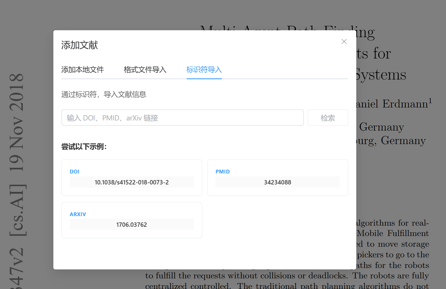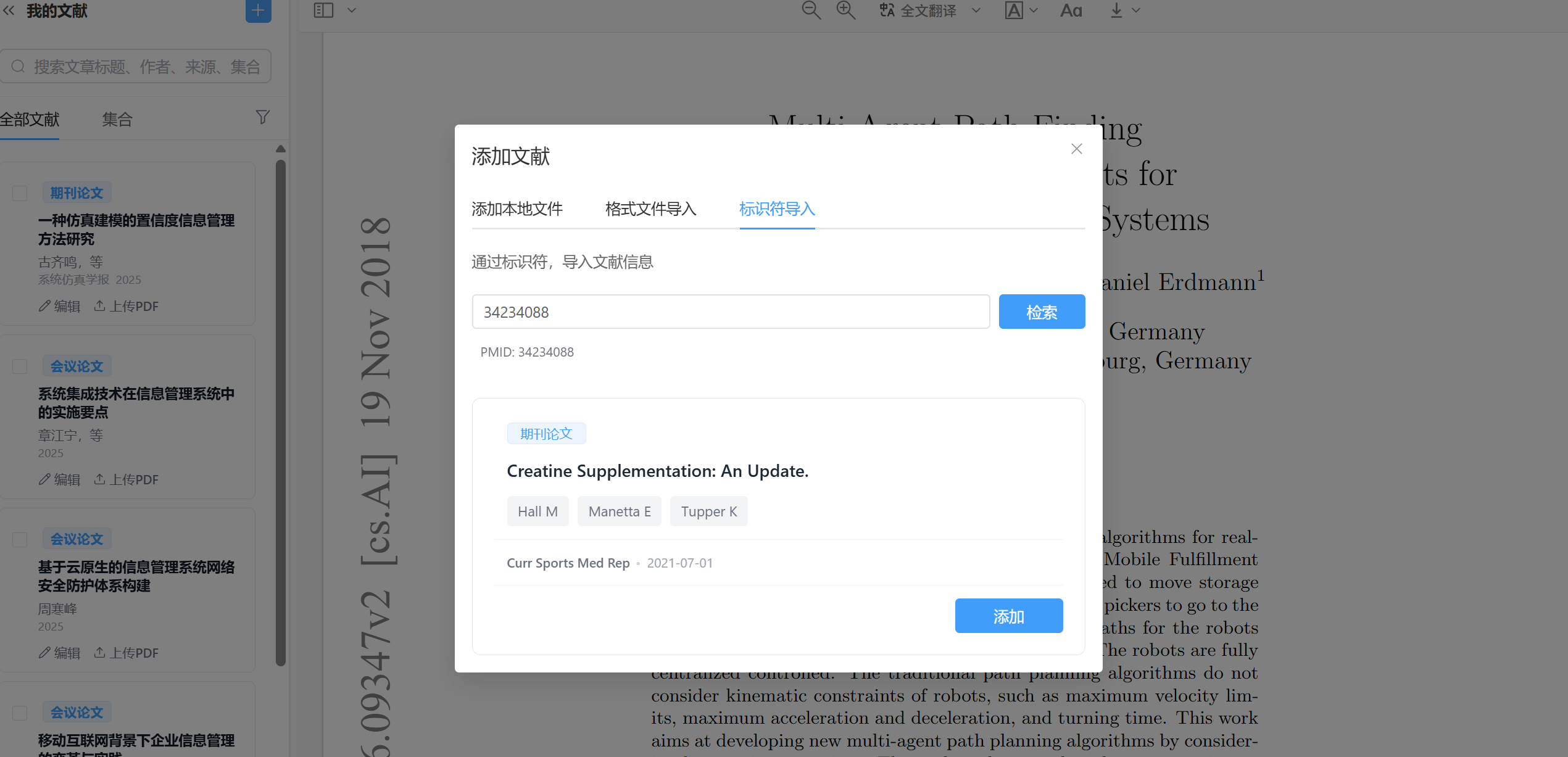 在添加文献 - 标识符导入,粘贴或输入 DOI、PMID 或 arXiv ID,检索并获取文献元数据。
