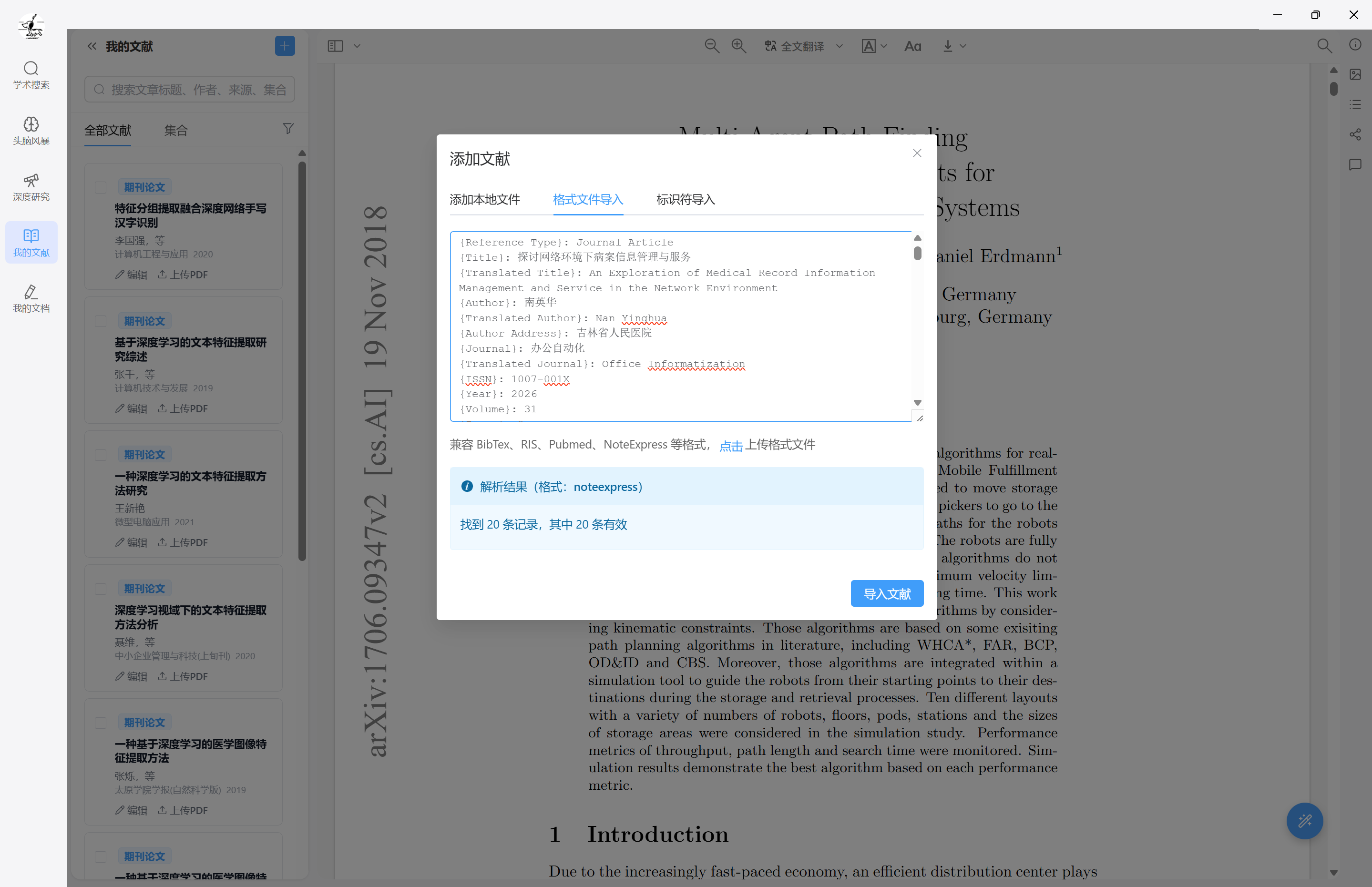 在添加文献 - 格式文件导入,粘贴或导入本地格式文件,识别格式化元数据: