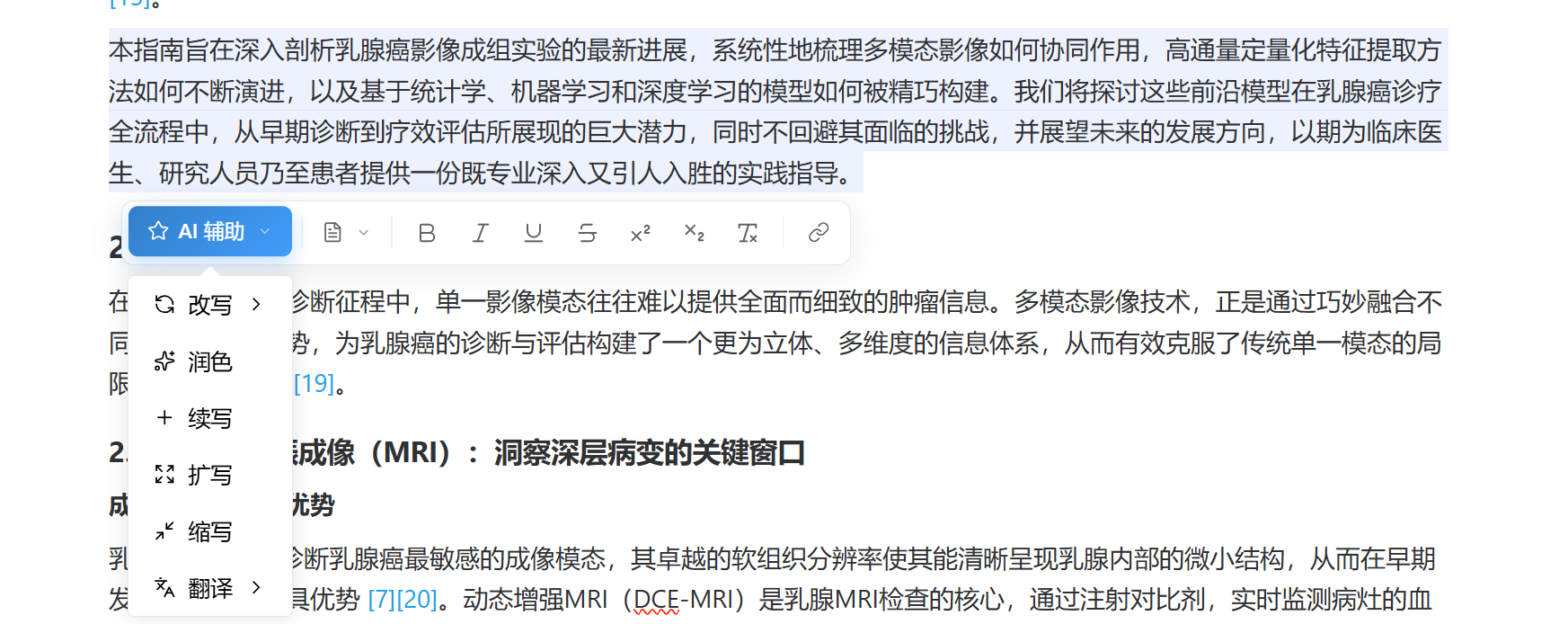 选中文档内容时,对应内容的周围会浮现工具栏。通过浮动工具栏,我们可以将文字设置为正文或标题样式,为文字添加加粗、斜体、下划线、上下标等样式,设置超链接,或者调用 AI 帮写功能,进行辅助写作。