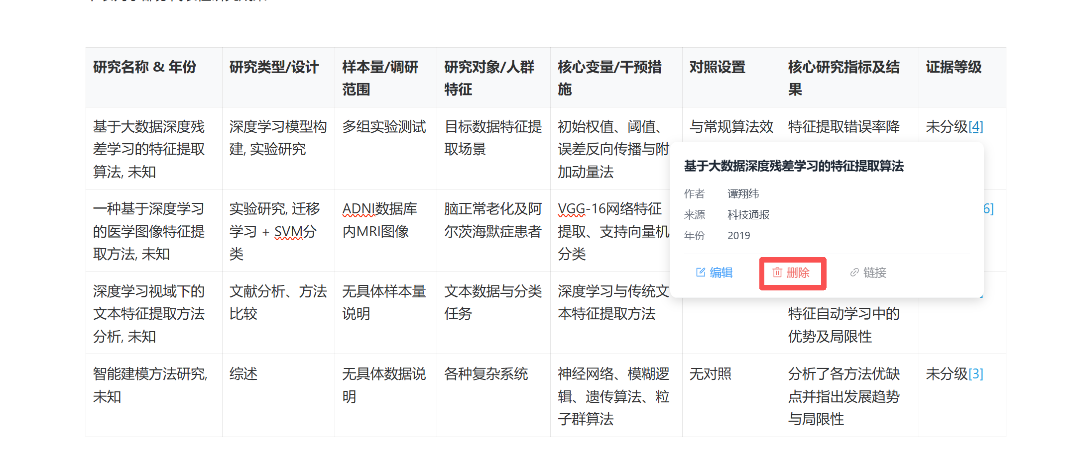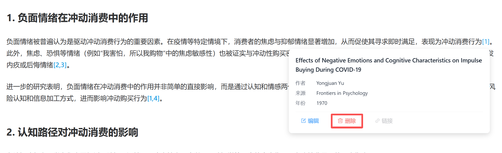 如不需要某个已经插入的引文,我们可以将光标移动至需要删除的引文位置,点击 “删除” 按键,删除引用的内容。