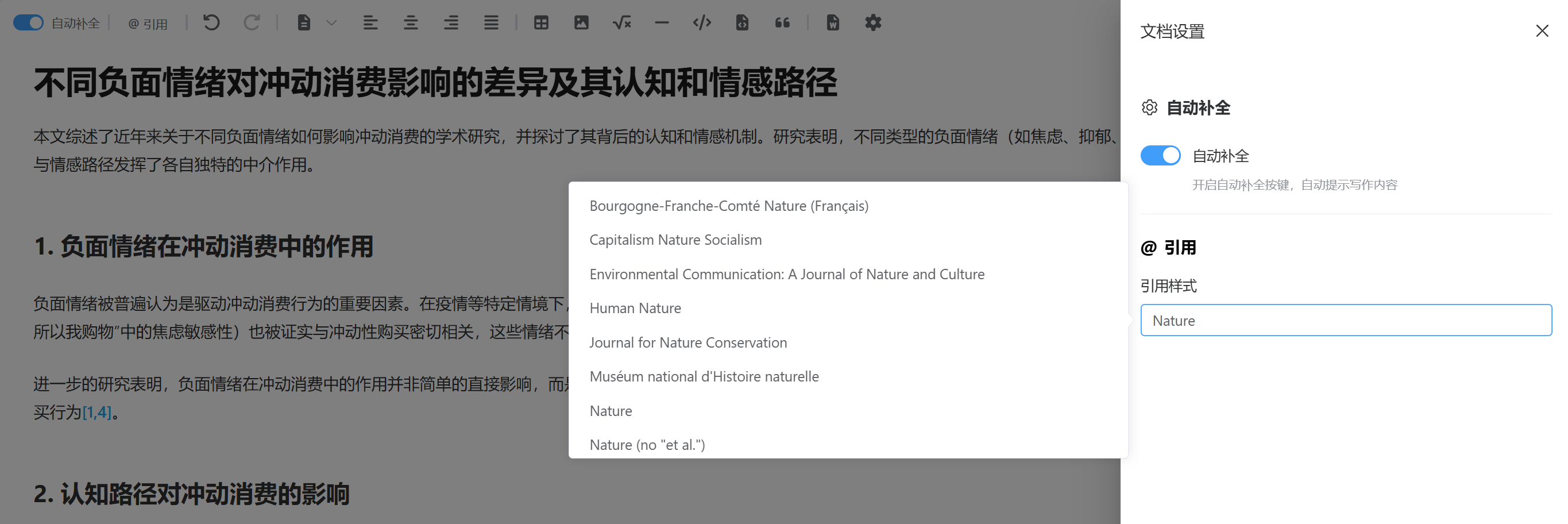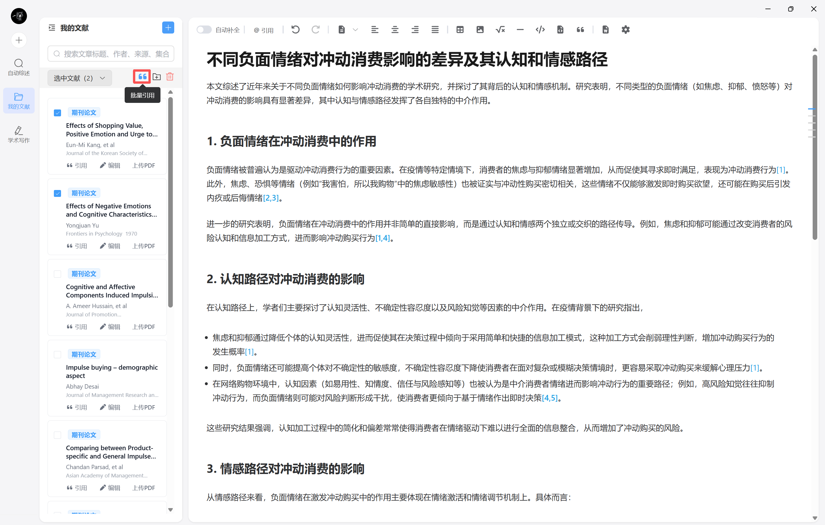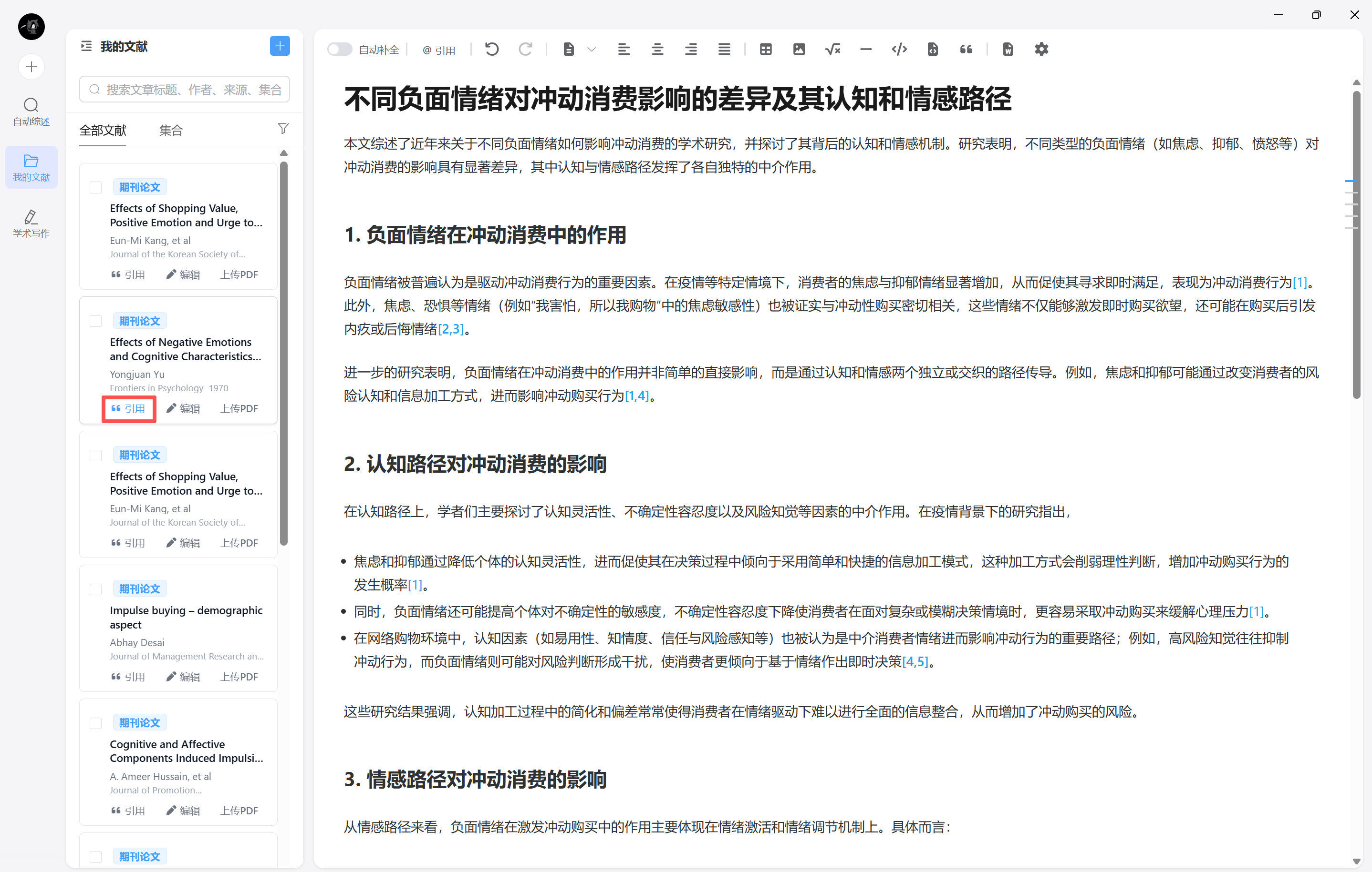 学术写作模块支持插入引文,并在文末生成符合学术规范的参考文献: