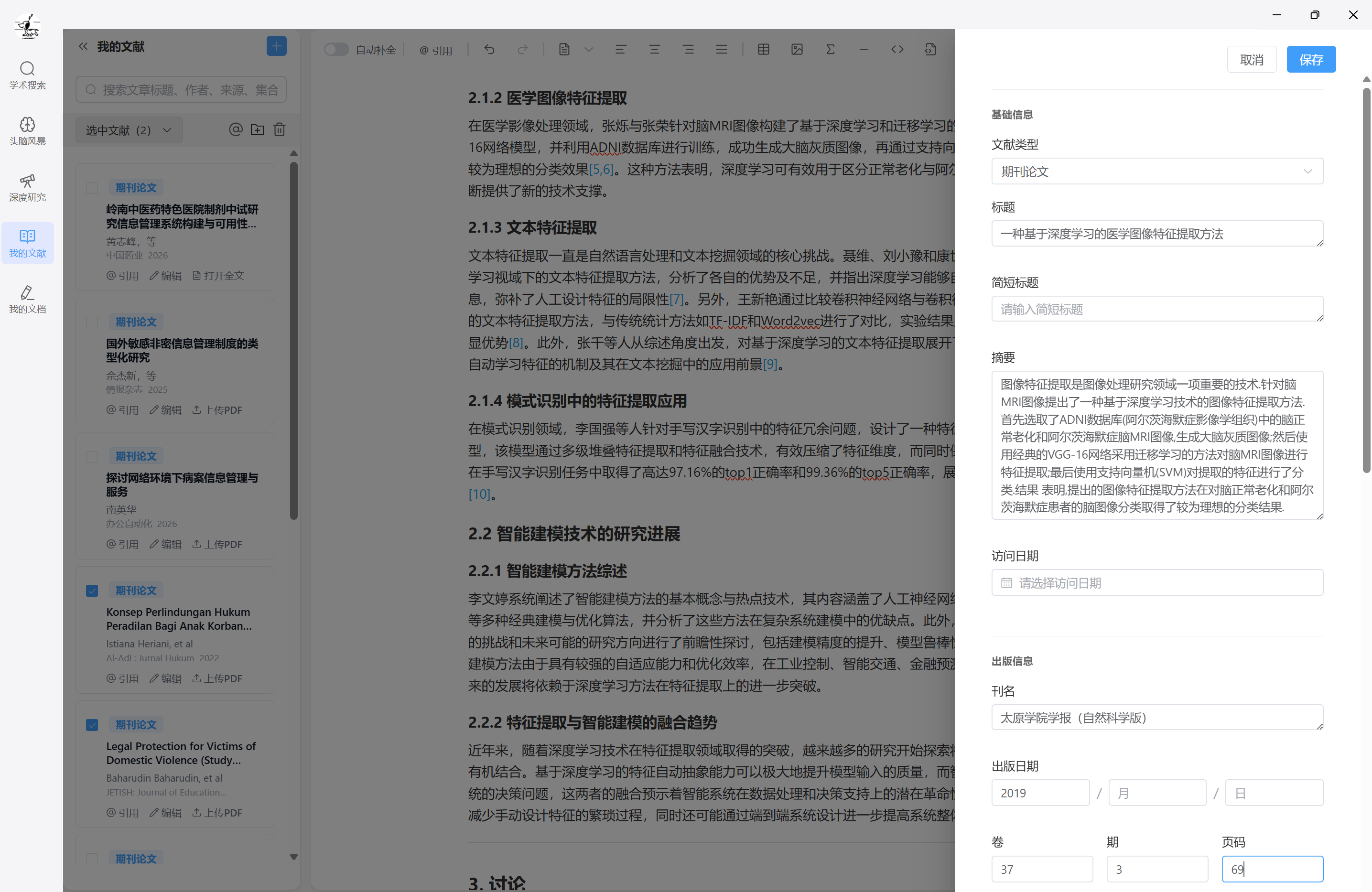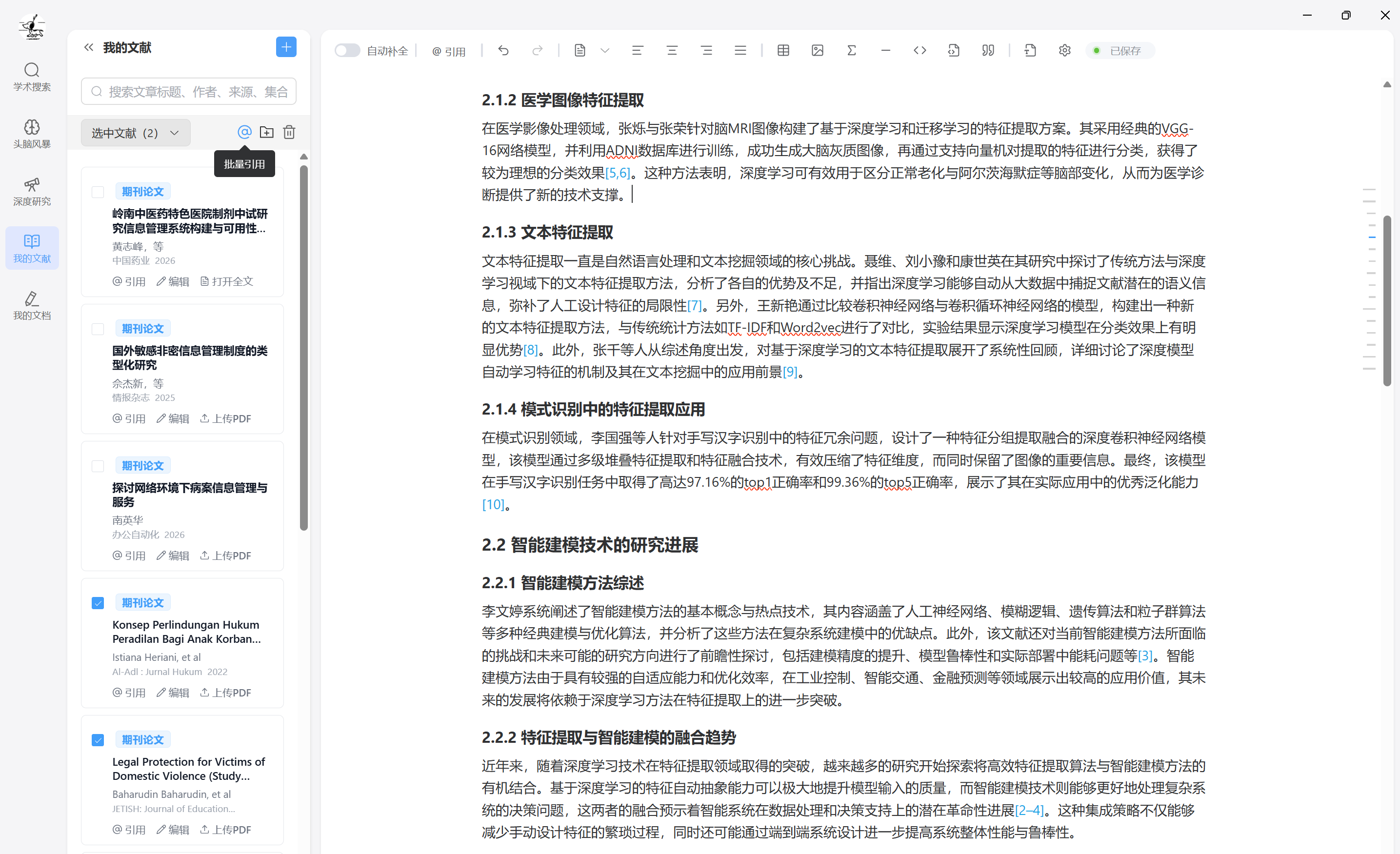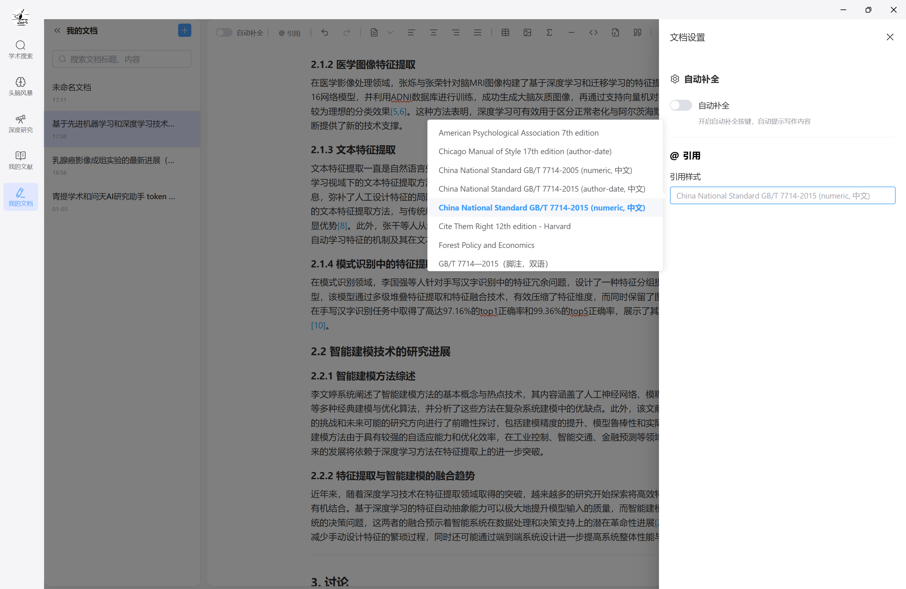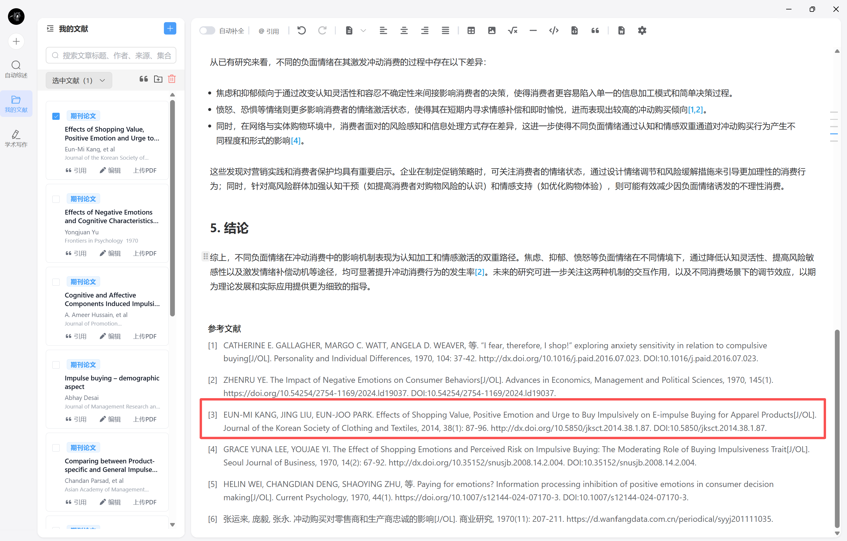 学术写作模块支持插入引文,并在文末生成符合学术规范的参考文献: