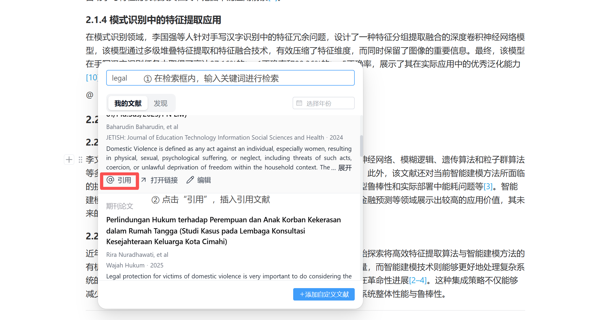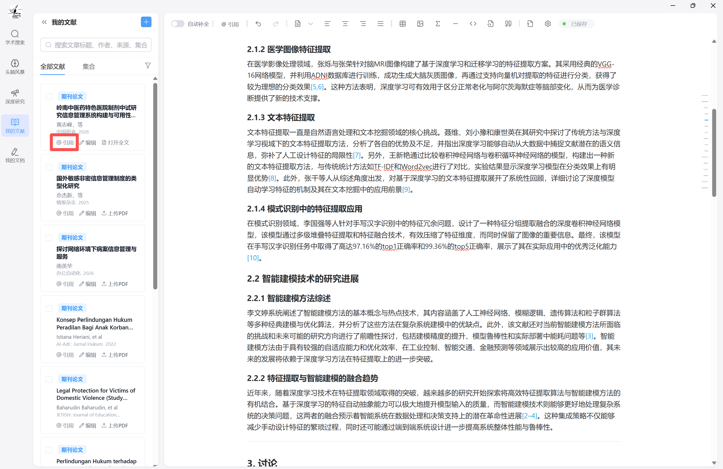- 在文档内通过 @ 快捷键,检索文献并进行快速引用