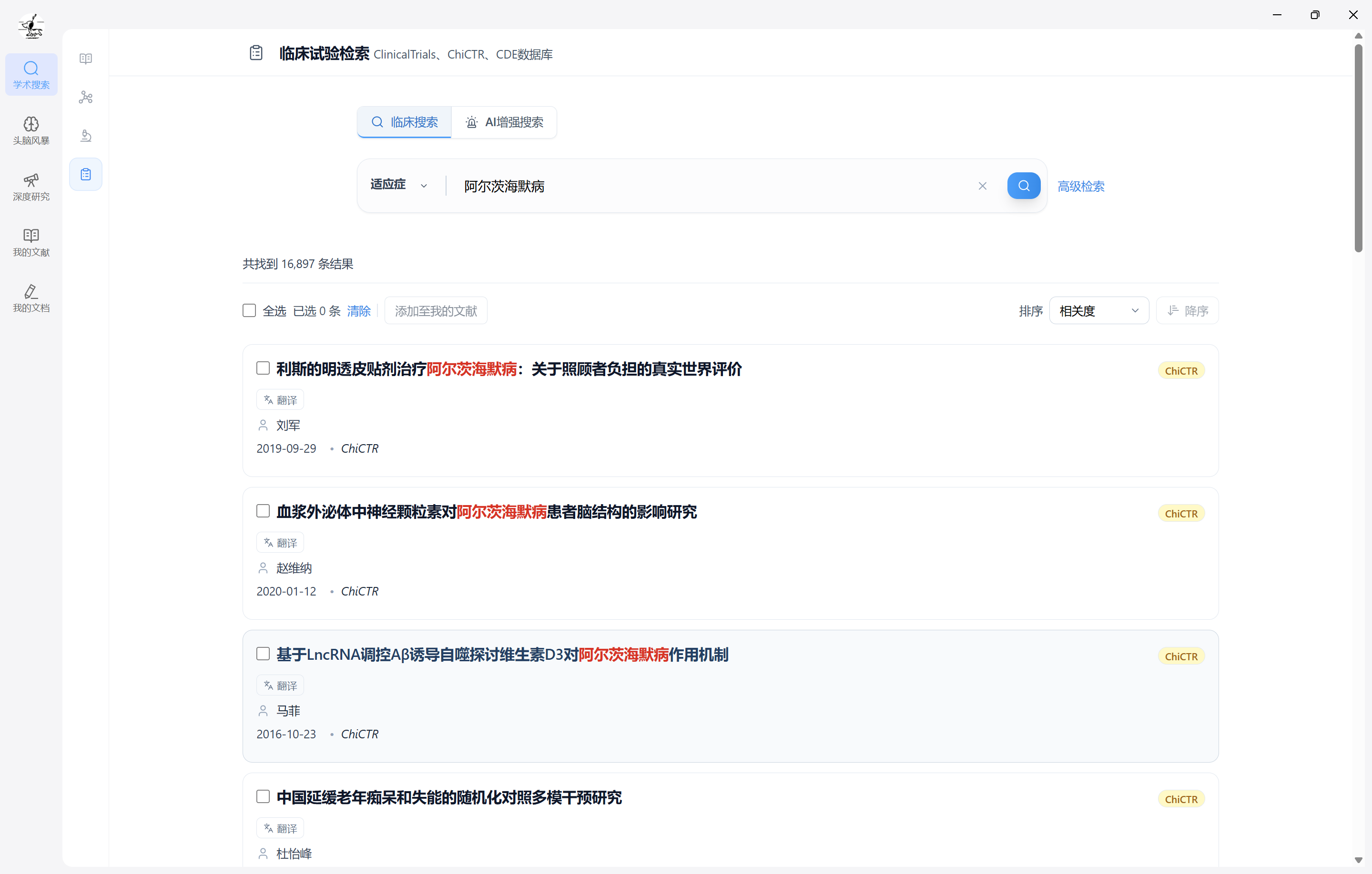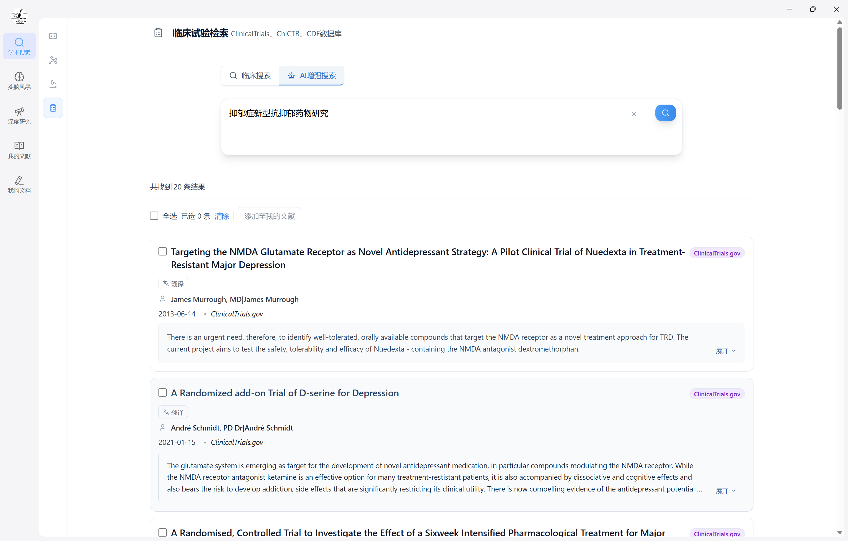 描述 临床试验搜索整合 CDE、ChiCTR 和 ClinicalTrials.gov 临床试验资源,支持进行一框式检索、高级检索和 AI 增强检索。