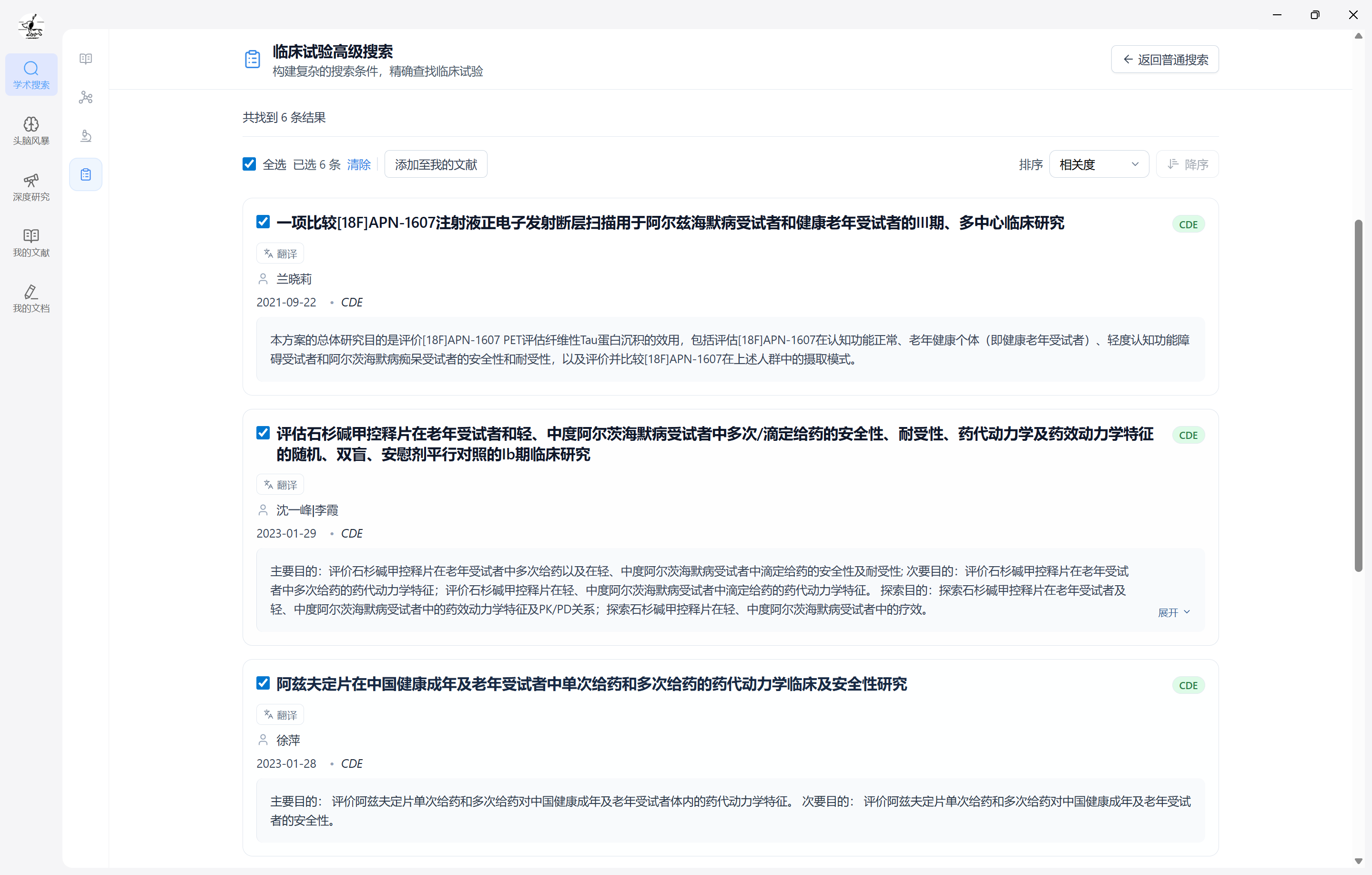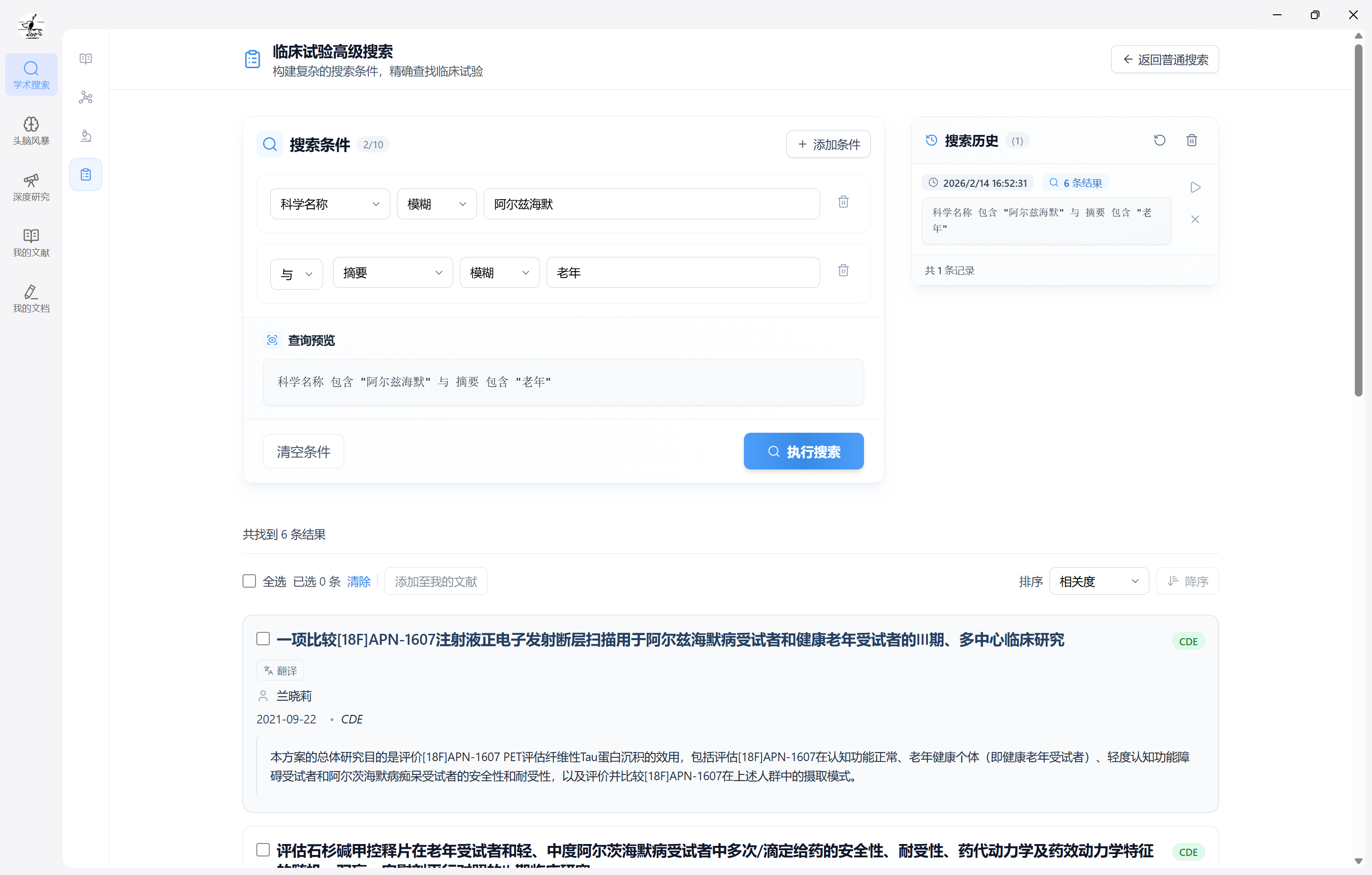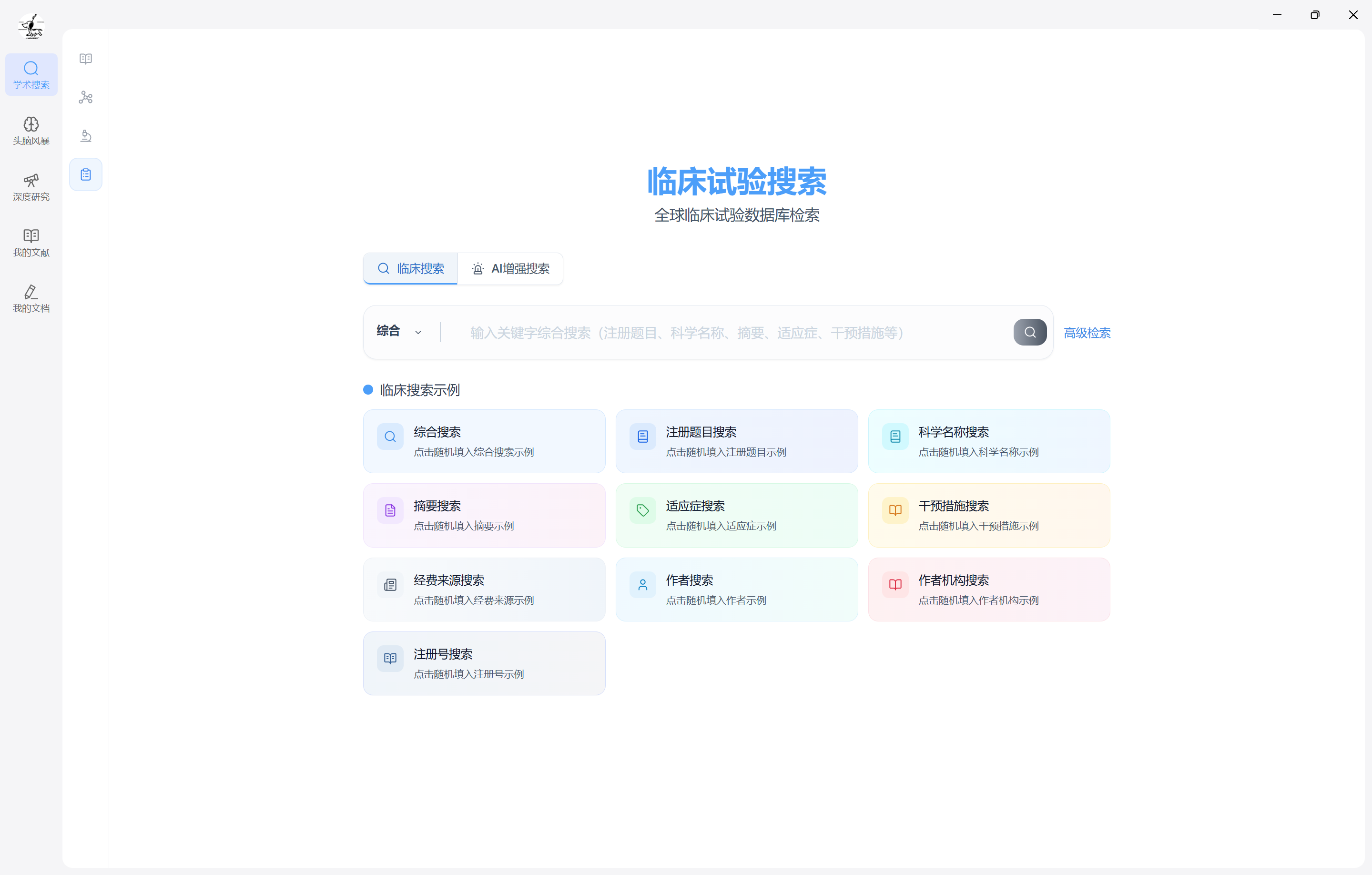 - 综合搜索:输入关键词(注册题目、科学题目、摘要、适应症等)进行检索;